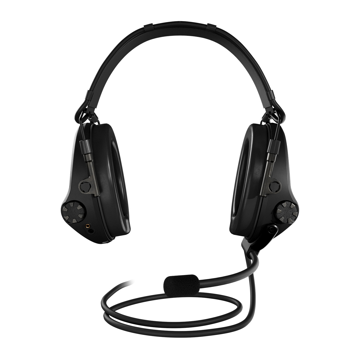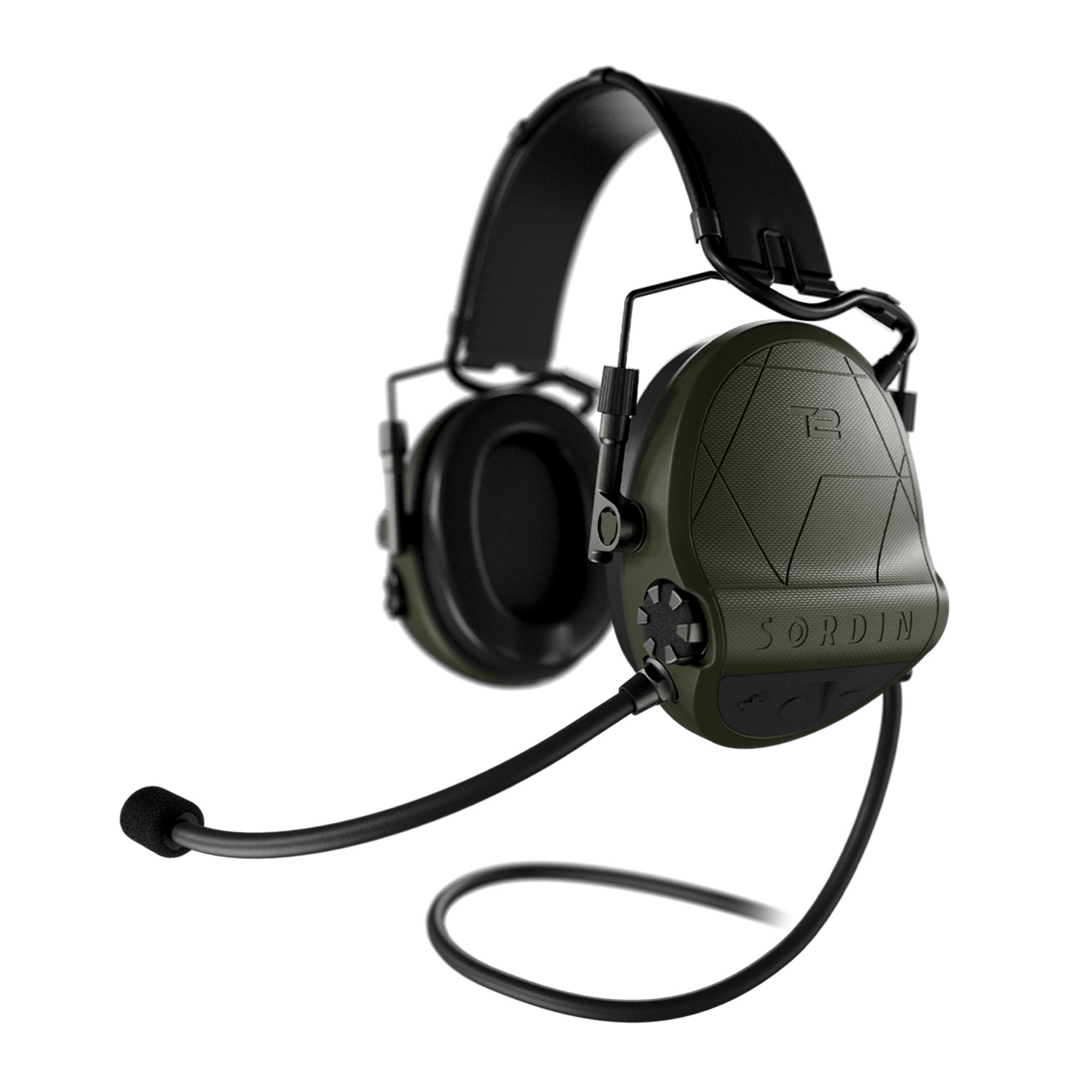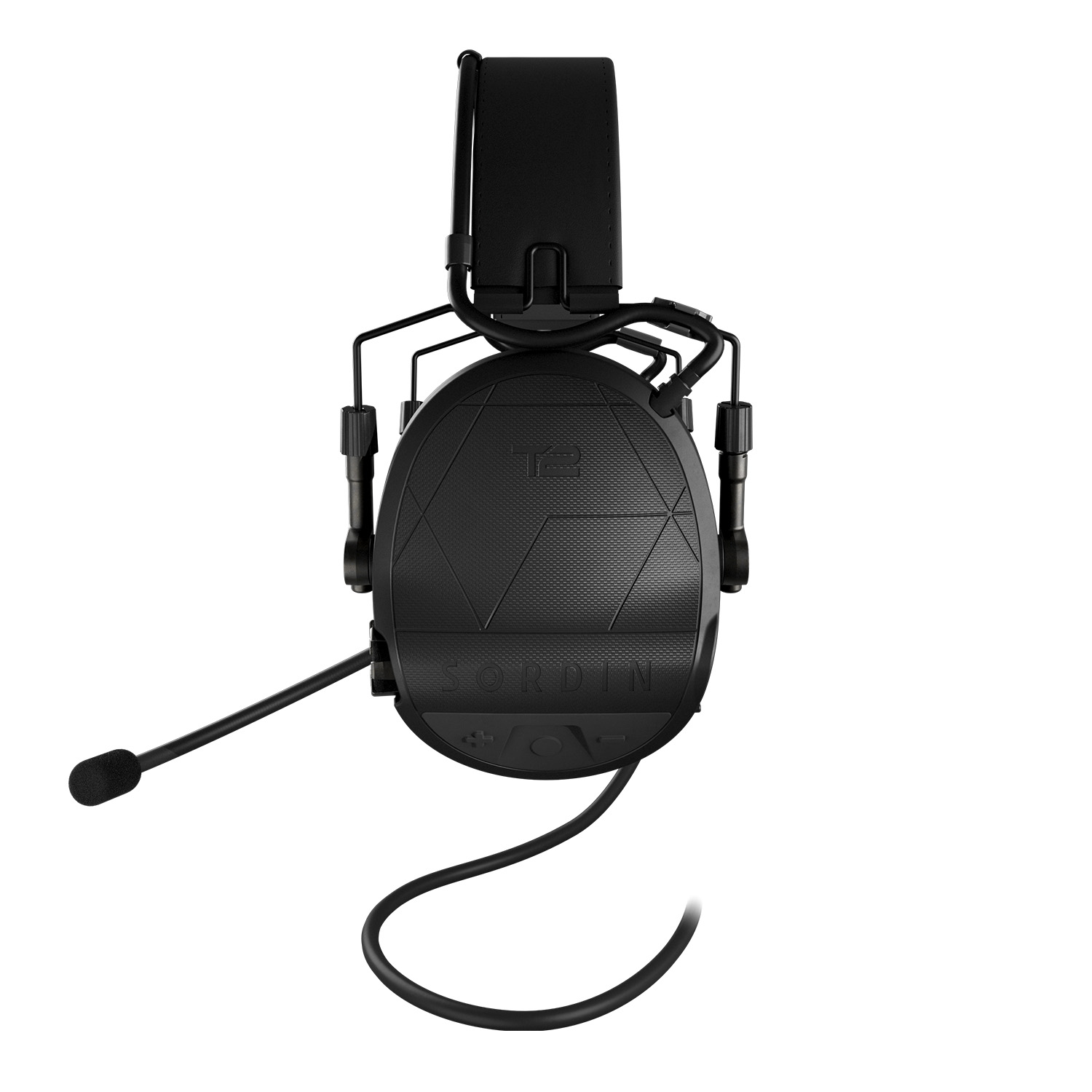 Sordin Supreme T2 CC Headband comes with a fixed boom microphone (mounted left) and an integrated downlead for connection to a PTT/radio/communication device.